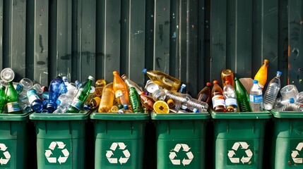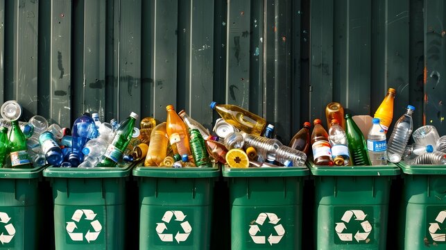 Green recycling bin filled with cardboard and plastic bottles in an urban city setting.