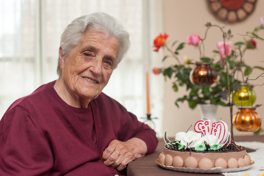 A smiling elderly woman wearing a party hat celebrates her 90th birthday with a cake and lit candles. Joyful milestone.
