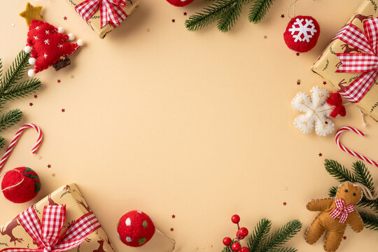 Colorful Christmas setup with wrapped gift, candy canes, pine branch, ornament, and gingerbread figure creates warm holiday vibes and New Year greetings in soft beige background