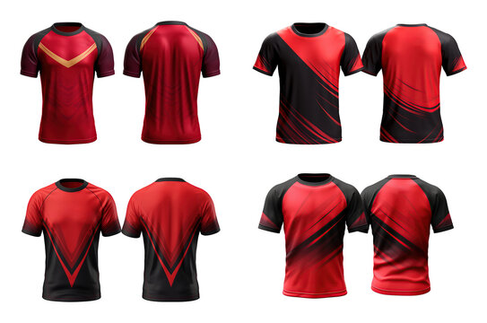 Set of blank sports shirt red and black design template, From front and back two sides, natural shape on invisible mannequin, for your design mockup for print, isolated on white background