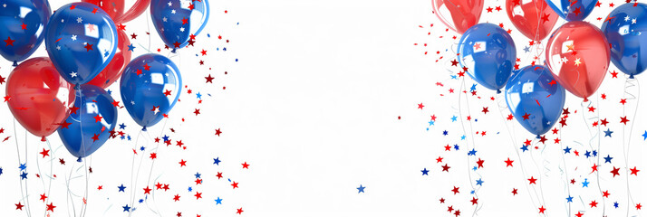 Blue, white and red balloons and stars confetti on a white background with copy space. Celebrating 4th of July banner.