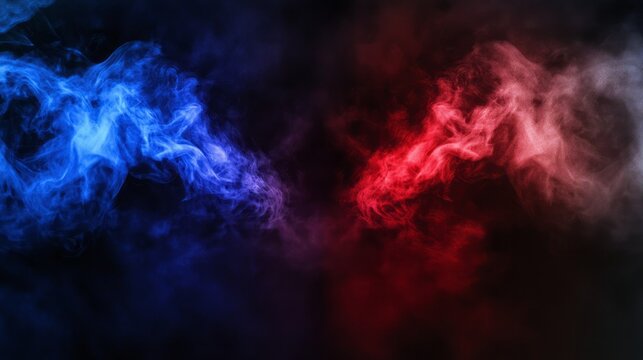 Dynamic blue vs red smoke effect background with abstract neon flame cloud and dust particles, representing cold versus hot concept for sports boxing competition and police digital banner design, feat