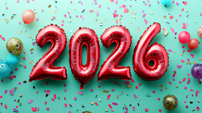 Bright red balloons shaped as the year 2026 are surrounded by colorful confetti and decorative elements on a vibrant turquoise background, celebrating a festive occasion