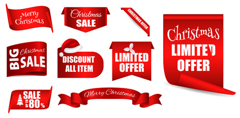 set of realistic red banner christmas sale isolated or scroll red paper christmas or christmas sale tag greeting. eps vector