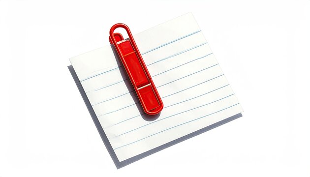 A red binder clip secures a piece of lined paper against a stark white backdrop, cast with a subtle shadow