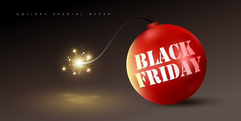 Christmas tree decoration. Red bomb ready to go off with golden sparkles on white background. New Year concept