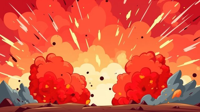 cartoon red bomb explosion clouds over destroyed burnt land. Boom effect with smoke,  Fire background,