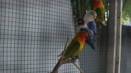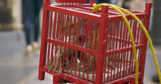 Small red cage with many birds standing in city street for sale. Bangkok, Thailand