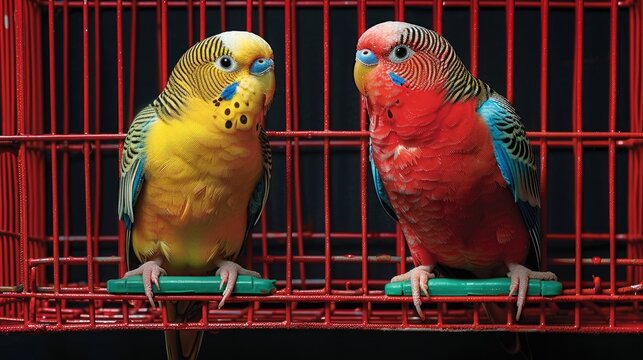Two colorful budgerigars in a red cage, showcasing their vibrant plumage.