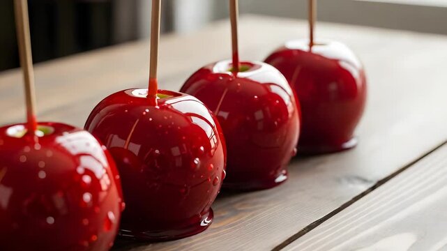 Vibrant Red Candy Apples Arranged on Rustic Light Wood Surface Simple Holiday Sweet Treat with a Glossy Finish