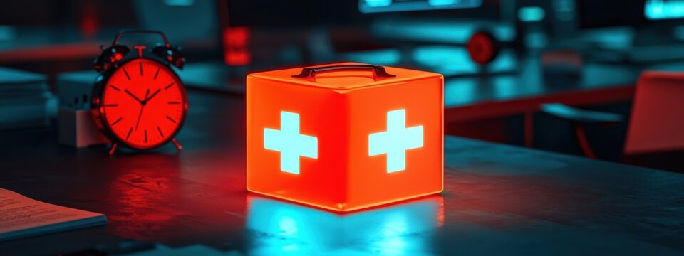 Emergency Medical Box with Red Cross Symbols Illuminated in a Dark Office Environment at Night