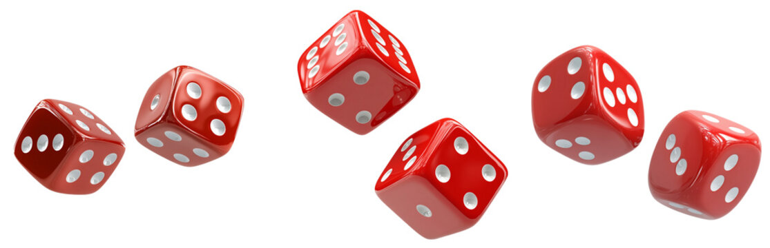 3d rendering of a set of six red dice with white dots hanging in half turn showing different numbers.