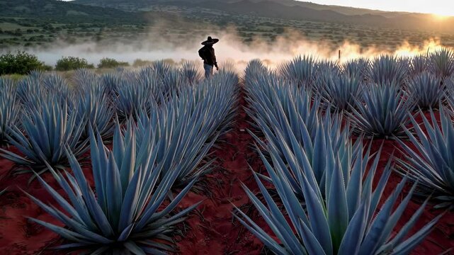 Majestic agave plants stretch towards the rising sun, their blue green leaves contrasting with the red earth as a farmer walks through the field, a silhouette against the dawn sky