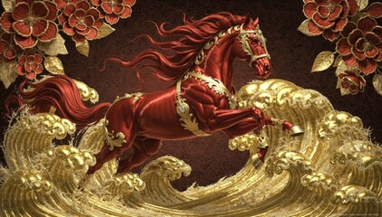 Paper-cut style golden horse with floral patterns on a red background, surrounded by paper flowers and hanging lanterns. Happy New Year 2026 greeting banner.
