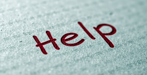 Text word, "Help " written in red fonts on rough surface
