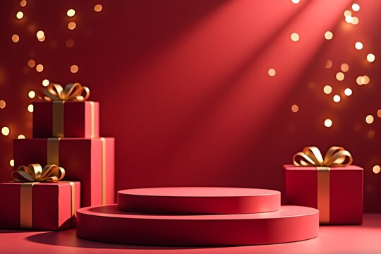Red gifts with gold ribbons on circular stand, festive lights glowing softly in cozy holiday scene.