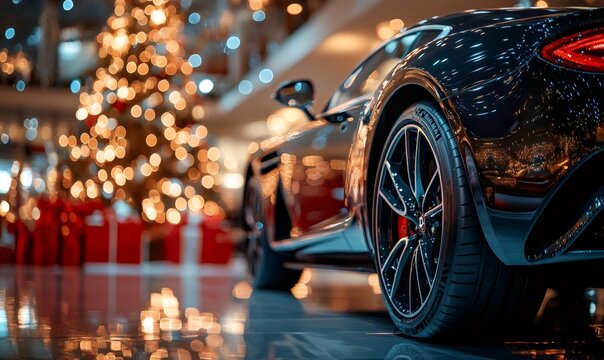 Shiny black sports car parked on a reflective floor, surrounded by bokeh lights from a festive christmas tree and red gifts