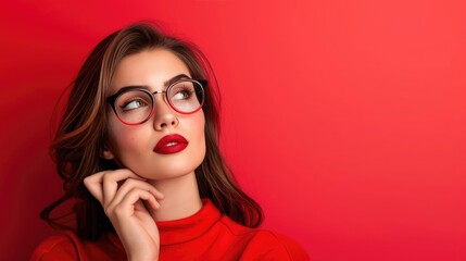 A stylish woman with red glasses and lipstick poses thoughtfully against a red background