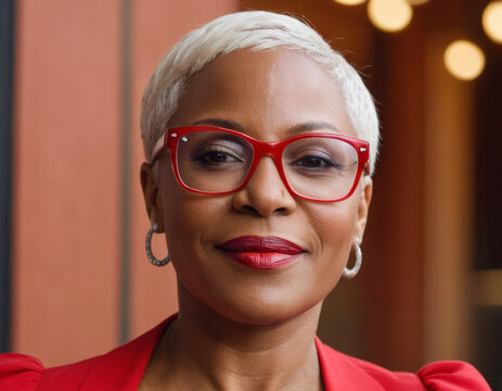 Beautiful 40-year-old Black lady with stunning short platinum blonde hair, wearing framed red glasses