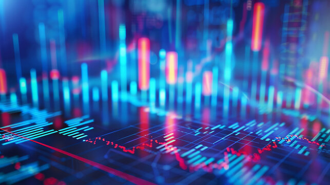 Futuristic data visualization. Glowing red graph lines and blue digital code on dark background. Abstract representation of financial or technological analysis.