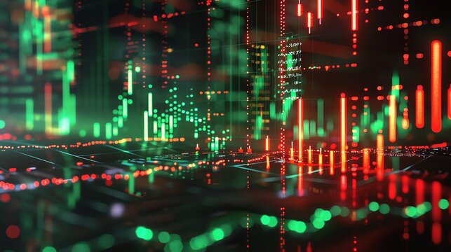 Abstract data visualization of financial markets with glowing green and red graph lines representing stock performance trends.