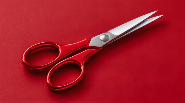 Sharp, shiny scissors with red handles are positioned diagonally on a solid red background, creating a vibrant and eye-catching composition, demonstrating precision and the concept of cutting.