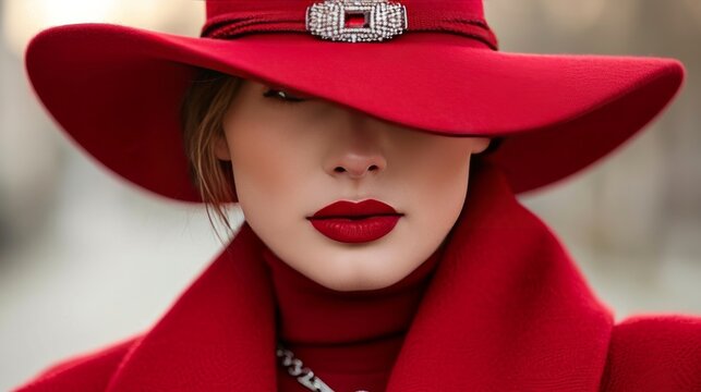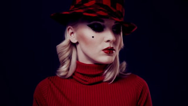 Beautiful woman in red hat with red lips posing before camera. Girl in retro fashion on dark background. Сosmetic heart-shaped beauty spot on the girl's cheek. Beautiful bright makeup, red lipstick.