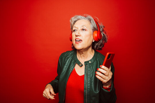 Senior woman wearing red clothes, with red headphones and red smartphone, dancing over a red background