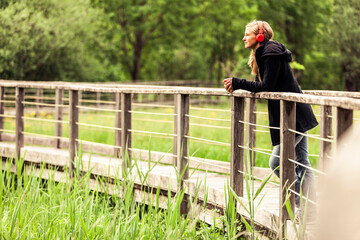 Young woman with red headphones standing on wooden boardwalk relaxing, Baitoni, Italy