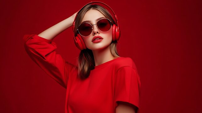 A young woman in a red outfit, wearing red headphones and sunglasses, looks confidently into the camera.