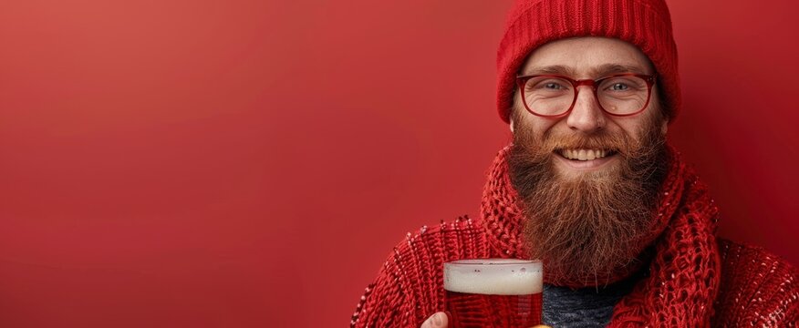 A man with a red knit hat and scarf smiles at the camera while holding a glass of beer in front of a red background