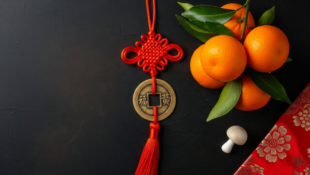 Chinese new year decoration with oranges and red knot