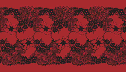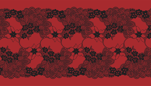 Delicate lace borders with scalloped edges and heart patterns on dark background. Valentine's Day decorative lace trim strips in pink and red tones for romantic design projects.