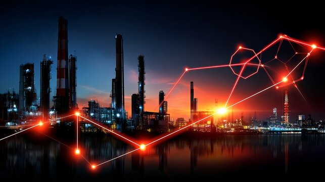 In the center of a bright blue sphere is a red line graph depicting the global market and business, set against a backdrop of hazy city lights