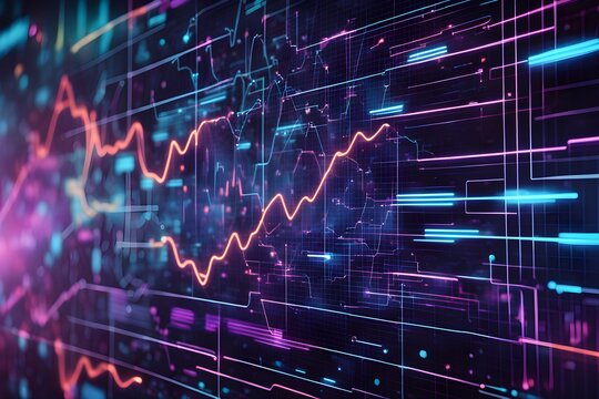 A 3D neon red line graph rising above a series of blue bars on a black background.