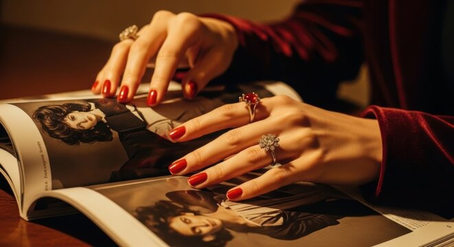 Female hands with red nails and rings flipping through fashion magazine