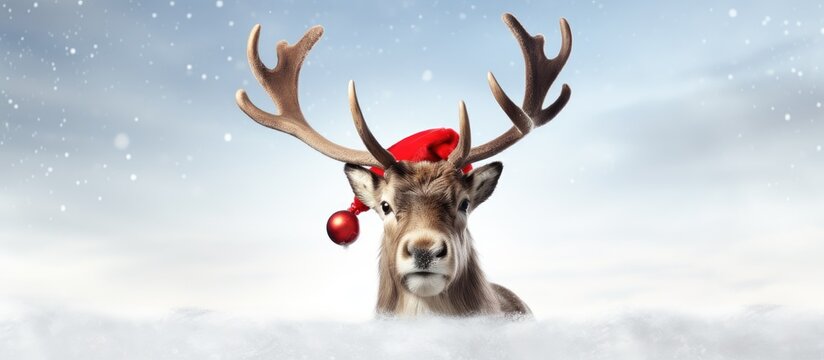 Reindeer with red nose and Santa hat on blue Christmas background. Christmas greeting card design. 3D Rendering, 3D Illustration