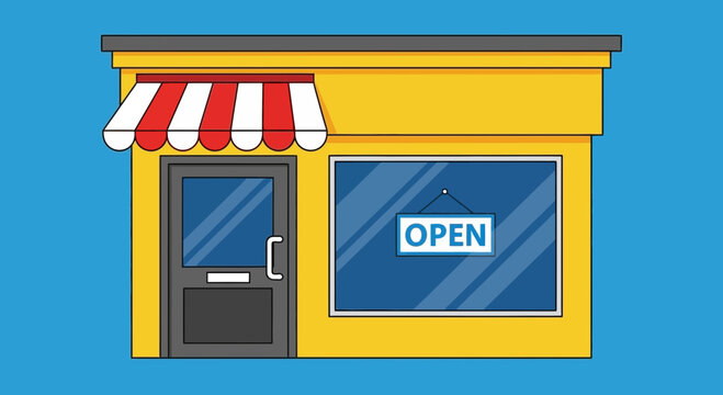 A charming yellow storefront with a red and white striped awning over a dark gray door and a large display window showing an open sign