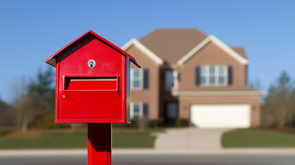 Banner with big red postbox with white empty note space for address at gradient blue sky background with copy space for text.