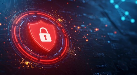 Cybersecurity digital data protection concept with glowing red shield and secure padlock symbol representing online safety firewall encryption and internet privacy technology