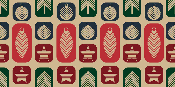 Seamless abstract pattern with blue, green, and red squares featuring silhouettes of Christmas ornaments on light background. Ideal for fabric, wrapping paper, and festive designs
