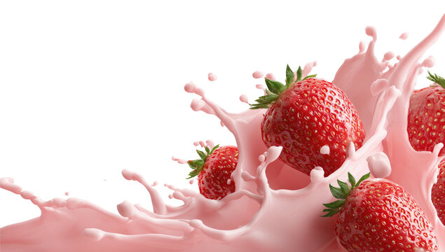 Bright red strawberries burst from pink liquid, creating a dynamic splash against a black background