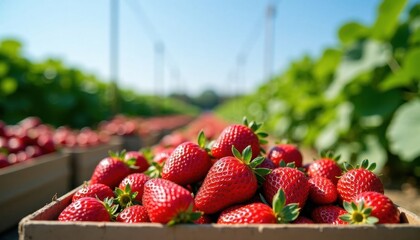 Fresh red strawberries in wooden crate amidst green strawberry fields under clear sky