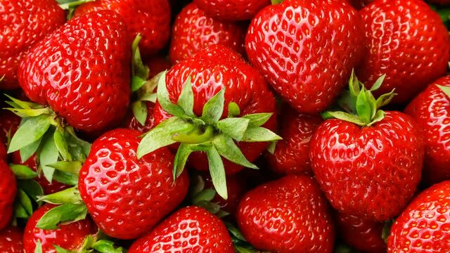 Beautiful ripe red strawberries close-up top view, turning.