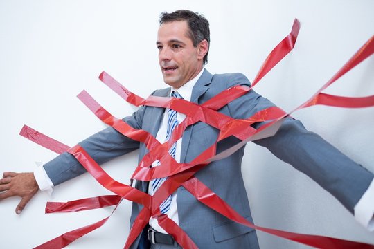 Red tape concept symbolizing bureaucracy and restriction. Broken and crossed tape on white background.