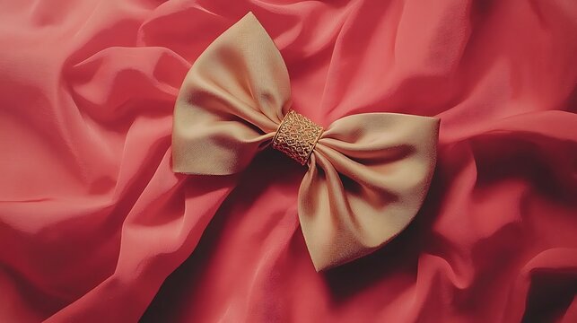 Warm red textile background with intricate golden bow and delicate shadows emphasizing luxury tone