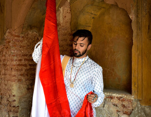 Man wearing kurta and textile standing and holding red textile hanging from the ceiling