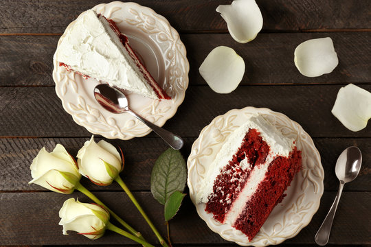 Red Velvet Cake with Love Message and Coffee.,A slice of red velvet cake with cream and a red rose on top