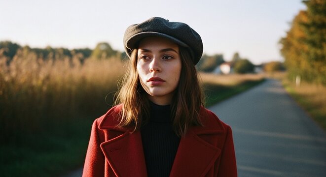 Stylish Woman In Red Coat And Beret On Country Road At Dusk
