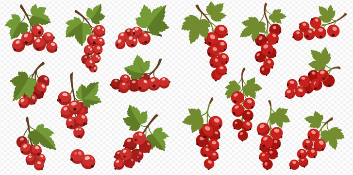 Illustration of redcurrant bunches with green leaves on a transparent background.